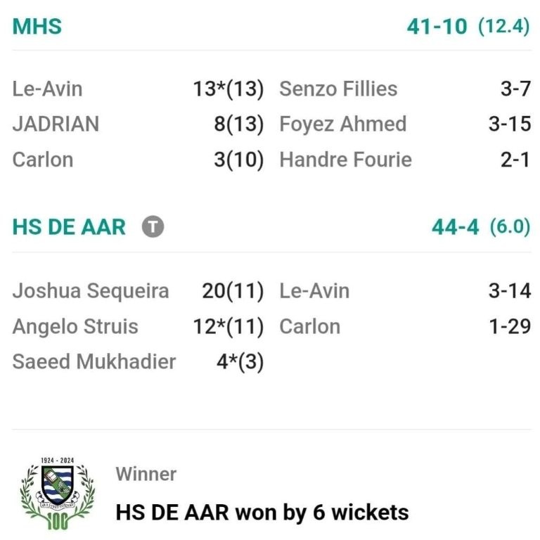 Joshua Sequeira het uitgeblink met 20 (11), terwyl Angelo Struis 12 (11) en Saeed Mukhadier 4 (3) bygedra het.